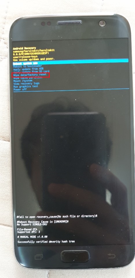 "Wipe data/factory reset"로 들어오셨다면, 상하단 이동은 [볼륨+],[볼륨-]버튼을 이용해서 "Yes"를 선택한 뒤, [전원]버튼을 눌러 실행해주시면 공장초기화가 시작됩니다. 공장초기화는 시간이 좀 걸릴 수 있으니 여유를 가지고 기다려 주세요